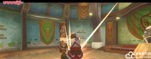 12、出来之后,林克戴上了自己的绿帽子,开始旅途,在出门后同学会给予林克背包,这样就能装备盾牌了。我么你在骑士学院1楼门口与老师对话获得木盾,可以去剑道场学习一下用法,然后绿色光柱的地方,跳下去。