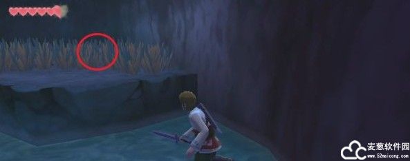 7、接下来去地图最右侧的瀑布,在瀑布旁的山洞,用剑把木桩打开就能进入内部,在里面有史莱姆和蝙蝠,非常好处理,击杀掉之后一直往前走,在下图位置的草后面有卢比(就是塞尔达传说世界中的货币)。