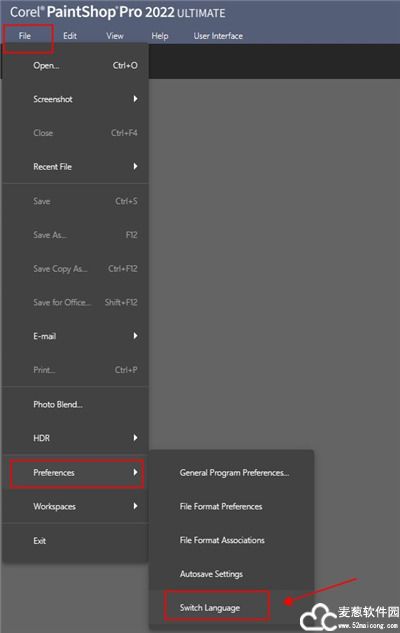 7、进入后还是英文,这里点击file-preferences-switch language选择设置语言