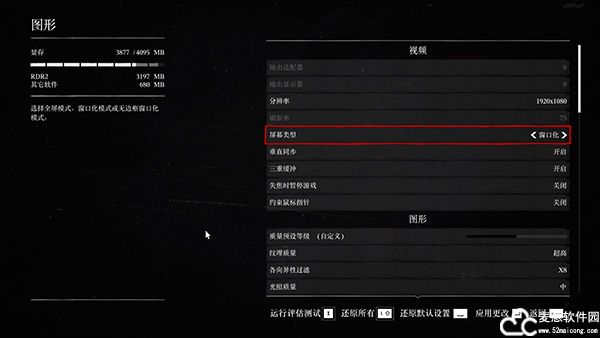 8、在荒野大镖客2豪华版图像设定中小编建议开启全屏运行,其他的画质和纹理根据自己电脑性能设置即可