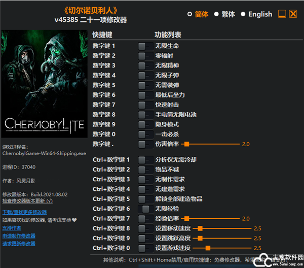 切尔诺贝利人二十一项修改器,由大家非常熟悉的风灵月影制作,能够帮助大家修改游戏里的基础设置,无限生命、零辐射、无限精神、无限子弹等,让你轻松成为游戏里的BUG存在,在面对重重危机时,可以轻松的迎刃而解。有需要的朋友们可以下载切尔诺贝利人二十一项修改器试试吧!