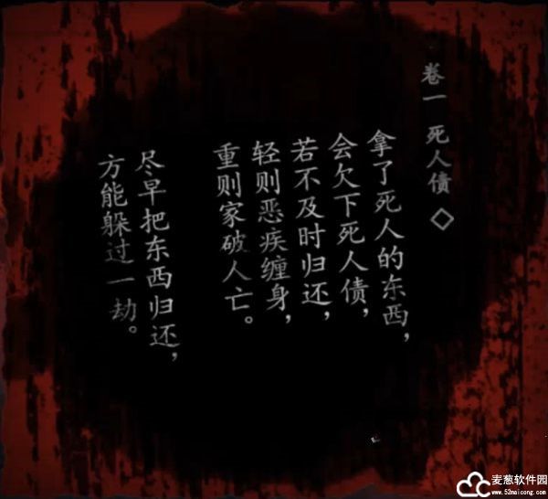 往回走,见到神秘女子,左边的路走不通,回头往右发现棺材挡住了路,再往左走发现又被花圈挡住了路。调查烟酒副食店,出现写满“债”字的遗像