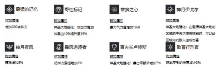 神佑有多种类型,分别是勇猛的记忆、野性标记、雄狮之心、神月伊戈尔、神月夜风、暴风追逐者、百夫长卢修斯、致盲行刑官。