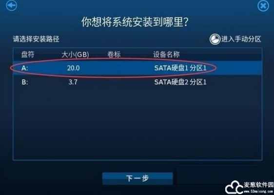 7、选择将华为鸿蒙系统电脑版安装所在硬盘分区,再点击下一步