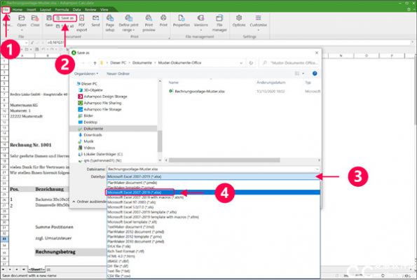 在Ashampoo Office 8中文版,点击 “文件” 菜单。然后点击 “另存为”。点击 “文件类型” 以显示支持的文档格式列表。选择 “Microsoft Excel 2016-2019 (*.xlsx)”