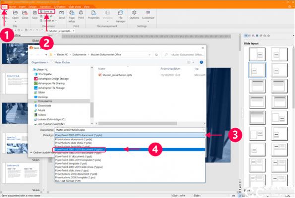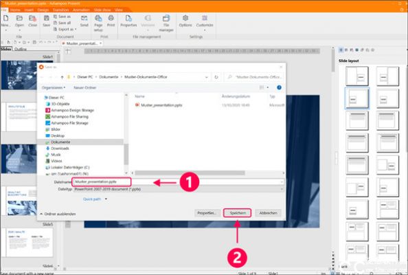 现在您按提示输入文件名。然后点击 “保存”。您的文件将保存为 Microsoft PowerPoint 的 POTX 格式