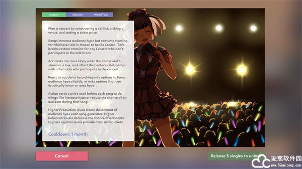 注意参加演唱会的偶像体力值需要过关,否则表演过程中可能出现各种事故(虽然事故也有正面效果)