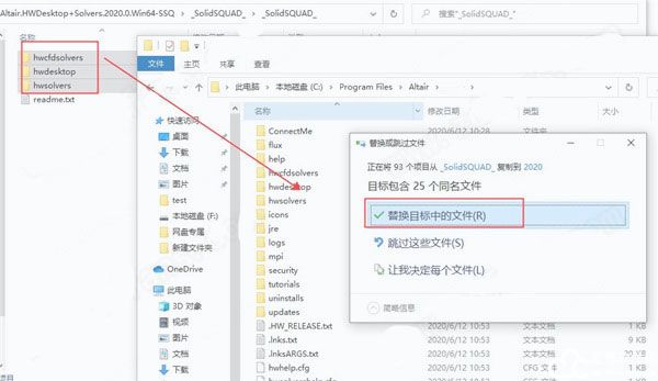 6、将hwdesktop文件夹复制到安装目录中,点击替换目标中的文件,默认C:Program FilesAltair2021,同样的hwcfdsolvers文件夹和hwsolvers文件夹也复制到该目录,点击替换目标中的文件即可