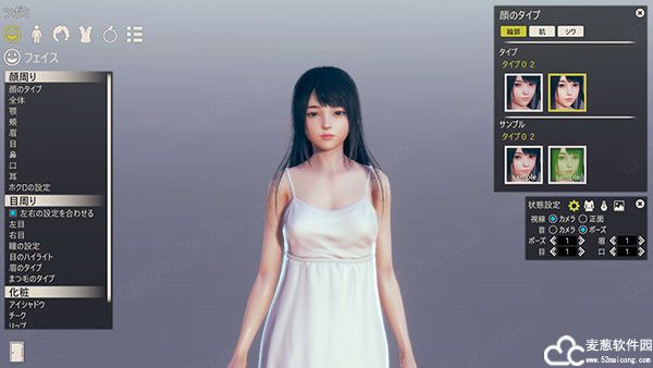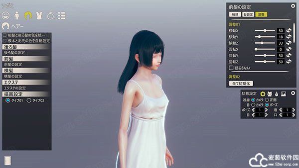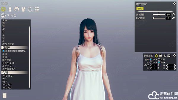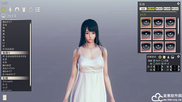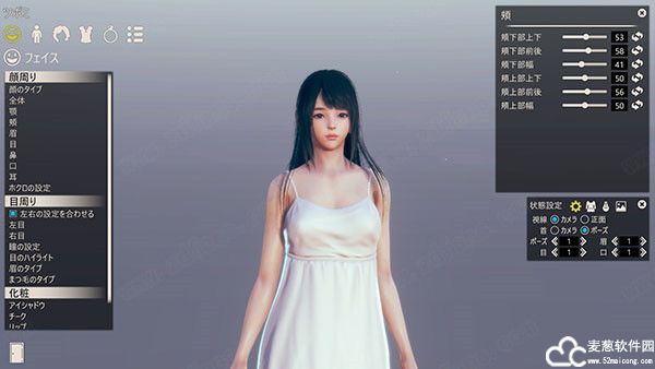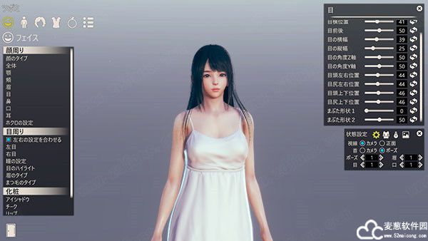 目、鼻、口、耳分别对应五官的细致调控。眼睛方面可以调节眼睛的位置和眼角的高低(决定了眼型),眼睛的位置游戏设计的很贴心,默认给的就是最佳值就不需要大动除非是有特殊癖好人士。外眼角(目尻)和内眼角(目头)的位置调节可以用来调整眼型,两端保持平行这样的眼型在现在算是比较主流的可爱系设定,当然如果喜欢帅气一点的类型那么就将外眼角稍微太高一点即可,此外眼睛还提供了眼睑(まぶた)的选择。鼻子详细到能捏整个鼻子的造型,前后角度,鼻翼的宽度和鼻子的高度等。嘴巴方面的调整和眼睛比较类似,除了大小属性的基础调整外,还可以调整嘴角的高低,像甜美系给人的刻板影响就是微微上扬而高冷一些的则保持水平。这里很多选项看似用不上不过I社都做得非常齐全给玩家提供了充分的选择