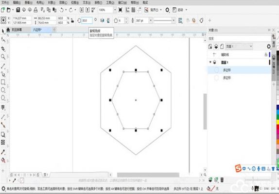 3、主要框架靠两个六边形来完成。我们这里利用快捷键Ctrl+C和Ctrl+V来复制一个六边形,然后用鼠标调整上方工具栏的“缩放比例”即可获得两个中心重合、大小形状一致的六边形了,再调整工具栏中的旋转角度,这里用30度,比较美观