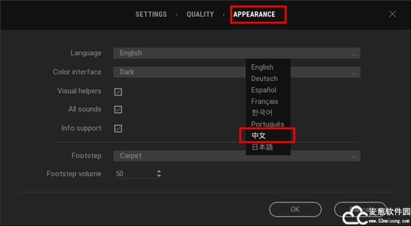 4、然后在点击Appearance项,找到Language,选择中文点击OK即可