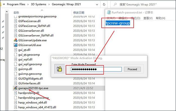 9、并以管理员的身份进行运行,找到软件包中的启动密码:tpcrew-group复制到注册机中,点击Proceed