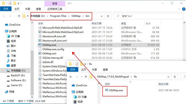 5、此时,打开Crack夹将“OkMap.exe”破解文件复制到软件安装目录中进行替换即可
