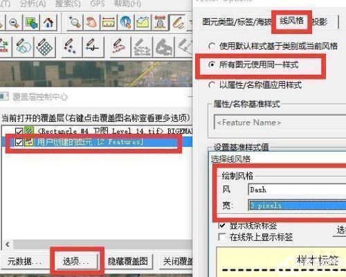 5、在弹出的对话框中,选中【用户创建的图元】,即:刚才规划的路径,然后点击【选项】,跳出窗口如下图:在弹出的对话框中点击【线风格】,勾选【所有图元使用同一样式】,在弹出对话框中选中线条的 样式和线条的 宽度以及 颜色