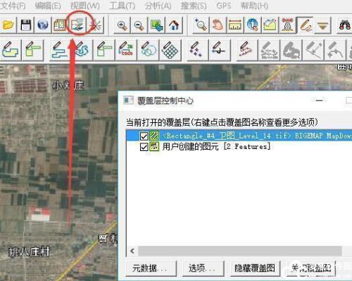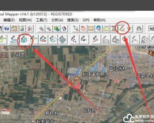 2、点击 Global mapper 工具栏上面的上方的 Digitizer Tool 数字化工具,然后选中左起第四个按钮”Create New Line/Area (Trace Mode)"
