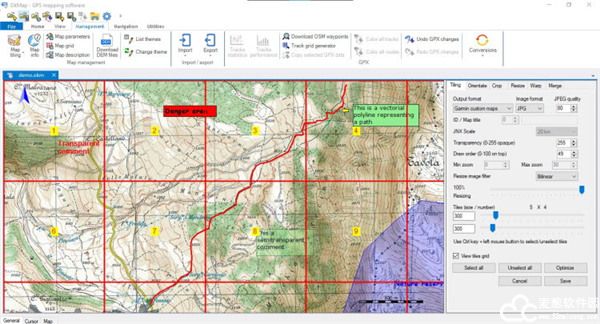 6、包含一项功能,可自动生成兼容的 Garmin自定义地图(KMZ格式)和OruxMaps格式的地图 。此功能包括不同图像文件格式(包括ECW地图格式)之间的地图平铺。可以选择KML扩展2.2(如果GPS支持它们),JPEG质量,图像大小调整,KML透明度,绘制顺序等。您也可以选择图块产生输出。此功能还不支持朝北的地图