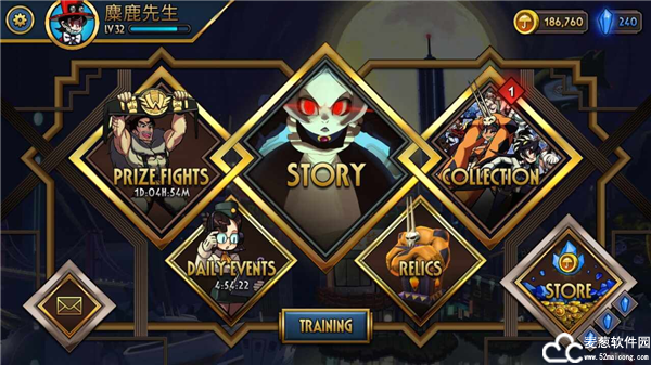 在骷髅女孩中文版,中间W型的五个菱形从左至右分别为“PRIZE FIGHTS(竞技场)”、“DAILY EVENT(日常关卡)”、“STORY(故事模式)”、“RELICS(纪念物/抽抽抽)”、“COLLECTION(收藏)”