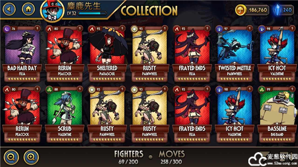 玩家查看自己已获得的卡牌的地方。左下为调整卡牌视图的大小。正下为切换“FIGHTERS(角色卡)”和“MOVES(技能卡)”,且下方数字对应持有数/持有上限。右下分别为“设置筛选条件”和“设置排序”。