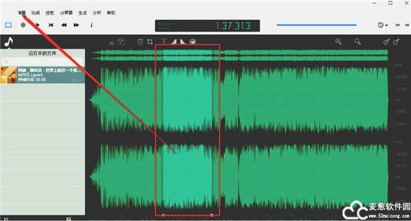 3、点击这个打开按钮将音频添加到软件之后,我们按住鼠标左键左右移动就可以在界面的音轨中选择想要裁剪下来的音频片段了,选取之后点击上方的编辑选项