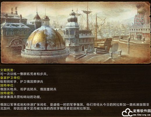 在游戏里俄国的寒冷和人海战术两项体现得淋漓尽致。10个一造的俄国散兵使前期快攻威力强大,而后期瞬间出现的长戟兵、火枪兵更是气势壮观。俄国散兵平均每个只要37.5食物10木材,加强卡片却够多够强,后期性价比高的离谱,形成垃圾兵海。俄国的骑兵实力同样强大,拥有骁勇善战的哥萨克骑兵、来自游牧民族的骑射手、还有擅长杀农拆房的沙皇骑兵,他们虽然在历史上为俄罗斯东征带来了极大的利益。在游戏里我们的骑兵是惹敌人厌的骚扰兵种。俄国还能拥有强大的防御建筑,火枪手可以直接就在战场上迅速建造强大的堡垒,让俄罗斯的后方防守阵地战非常坚固。