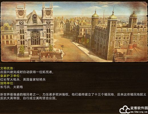 英国是工业革命的发源地,靠着海盗打垮日落西山的西班牙后成为第二个日不落帝国,又在英荷贸易战中击败劲敌荷兰成为环球贸易帝国,在七年战争重创世仇法国取得北美、澳洲、印度等超大面积的殖民地,成为名符其实的日不落帝国。游戏中的教学就是用英国最为模版来教导初学者。英国的特点是军事、经济两不误,造房子快速生产村民往往使得前期经济瞬间大爆发,是帝国3中著名的经济强国之一;红衣火枪是帝国3中最强大的火枪手,拥有一系列加强卡和教堂科技加成,可以将英国的军事优势一直保持到工业革命前。英国还能逆向致力于发展曾在中世纪出现的长弓手等。在英法百年战争中大显神威的长弓手可以攻击百年后的法国士兵和日本弓箭手。