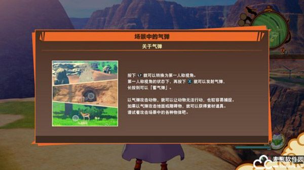 按下F键就可以转为第一人称视角同时在屏幕中央会出现准心,可以通过鼠标右键来释放气弹,按住则可以发射蓄气弹。被气弹击中的动物会无法行动也可以用于攻击周围环境来获得道具