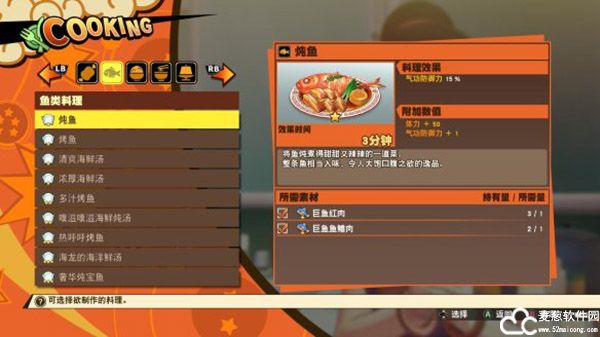 制作的方法与烤鱼一样,所需食材会标注在右侧菜单,玩家可以查看当前能够制作的所有料理