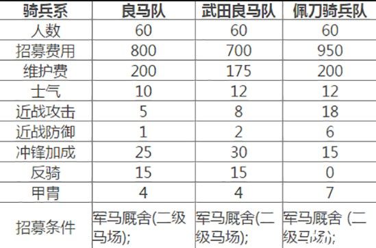 武田良马队则是该兵种的究极版本,全方位强化了数据的同时降低了维护与招募费用,武田良马队与武田赤备队组成了武田家前期的核心兵种