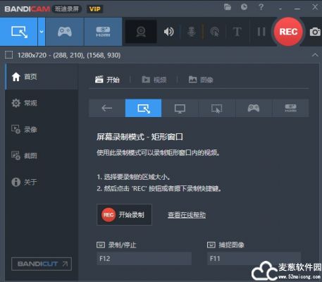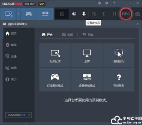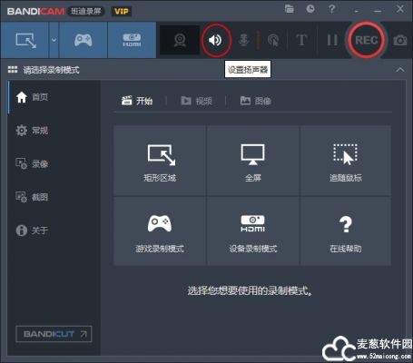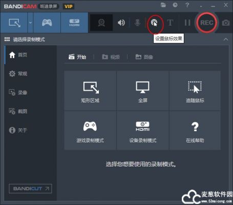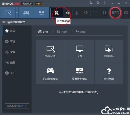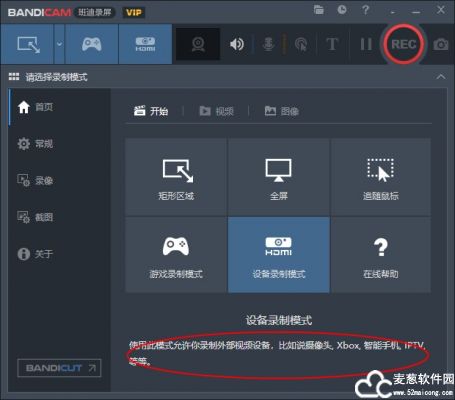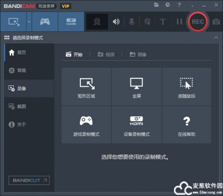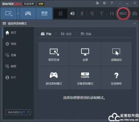 1、bandicam便携版首页,分为六大板块,矩形区域、全屏、追随鼠标、游戏录制模式、设备录制模式;