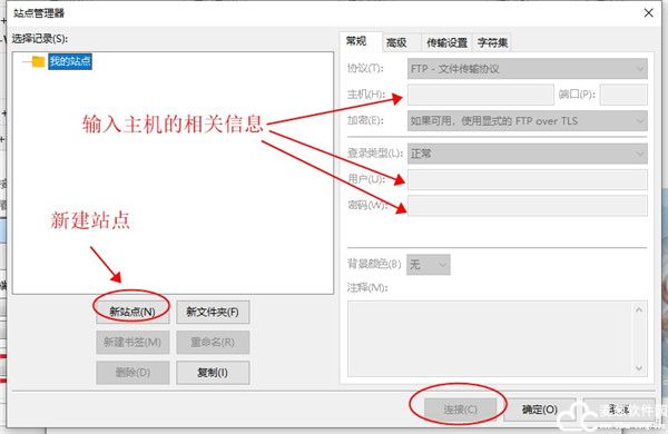2、添加新的站点,在主机、用户以及密码栏内输入主机的相关信息后,点击连接;