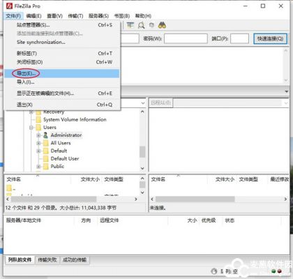 1、在fileZilla中文版,点击文件,导出选项,可以设置导出站点管理器记录、导出设置、导出队列以及导出过滤器;
