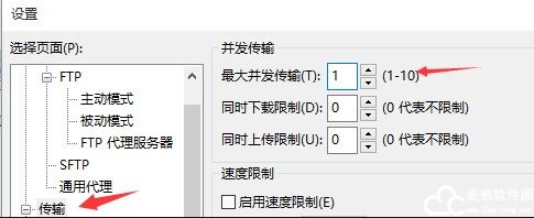 1、打开软件设置界面,找到“传输”选项,设置“最大并发传输”为1即可,不过这样设置是全局性的,不建议这样做。