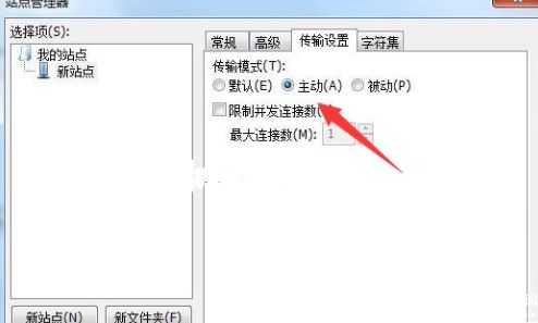 在fileZilla中文版,要设置的站点连接,切换到“传输设置”选项,勾选“限制并发连接数”并设置“最大并发连接数”为1,勾选传输模式为“主动”。