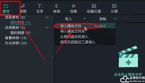 1、打开软件,再素材里面找到导入媒体文件
