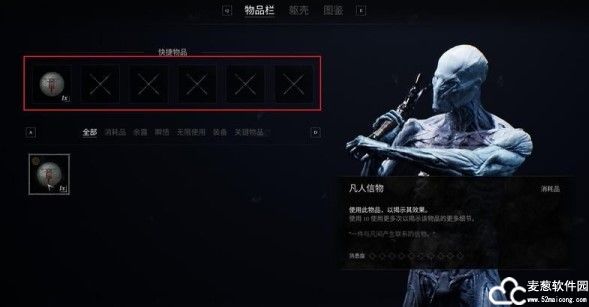 注意红框处的快捷栏,总共可以放置6个物品,平时按Q就能使用快捷栏物品。