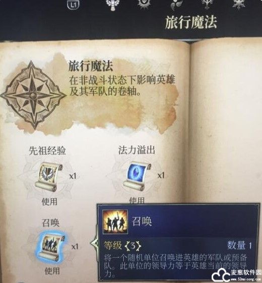 1、在国王的恩赐2中文版,这是一个在路上见到的卷轴,在旅行魔法一览里面,顾名思义能召唤出最大和你统帅值一样的单位,具体记得在哪捡的,大家路上要仔细搜刮。