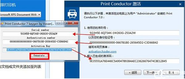 9、将软件提供的序列号和身份验证号输入注册机当中,点击Generate,获得软件激活码,在将激活码复制到软件当中,点击下一步