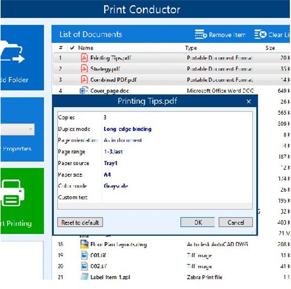 Print Conductor破解版,可以在任何类型的打印设备上打印文档:本地打印机,网络打印机或虚拟打印机。此外,您可以调整所选打印机的设置。如果将软件与虚拟打印机软件(例如Universal Document Converter)一起使用,则可以将文档列表转换为PDF,TIFF或JPEG