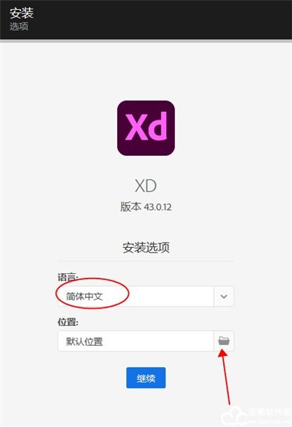 2、在红色圆圈内的语言栏内选择简体中文,在默认位置一栏可以更改安装路径;