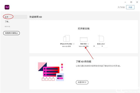 1、打开Adobe XD 43破解版,在主页选项里,打开Web,新建一个文本文档;