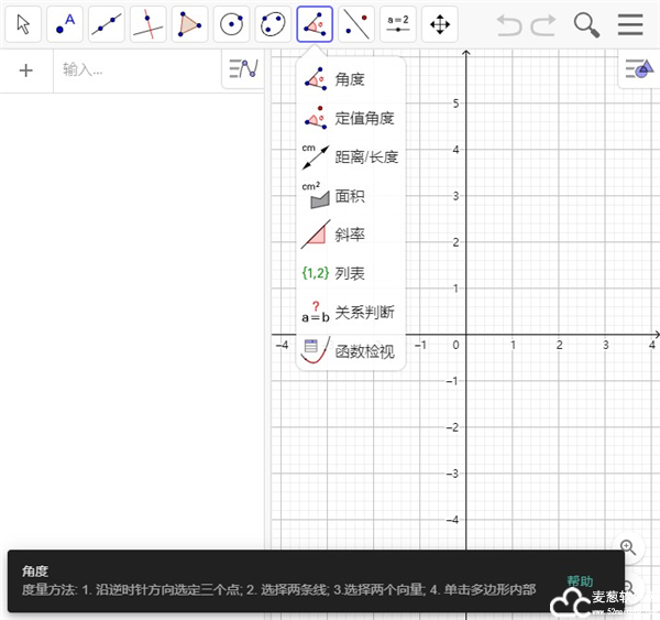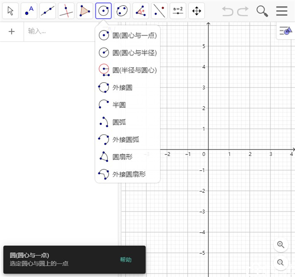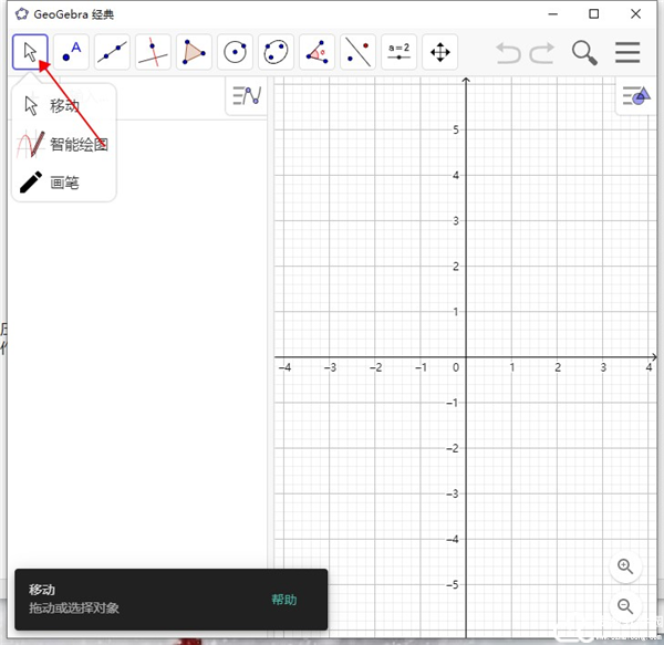 GeoGebra经典版,可以借助工具栏中所提供的作图工具,在几何区中使用鼠标进行几何作图。从工具栏中选择其中一种作图工具,可借助工具使用提示(在工具栏后方)来得知如何使用所选择的工具。任何在几何区中所产生的对象,在代数区中都有一个代数特征。