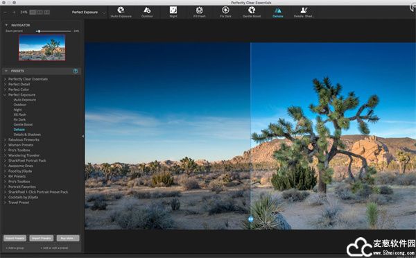 提供了大量的自动图像校正技术 - 所有这些技术都打包成几个不同的预设,让您可以调整图像的外观。要将这些预设应用于图像,只需单击顶部预设栏,左预设面板中的按钮,或在右下方状态栏中选择预设。