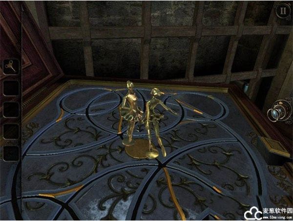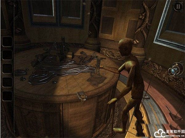 钟楼模型侧边有一个小棋盘,只要将右边一排棋子都打掉,即可获得一个金色小人;还有一个很有趣的,就是音乐盒解谜,将钟楼上获得的金色小人重装于音乐盒上并使其运动,可获得一个红色的宝石。