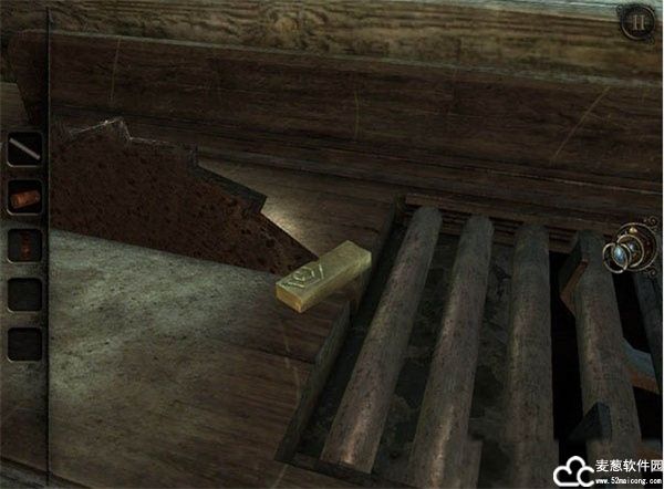 打开那扇门进入新的房间后,除了看看里面有哪些东西可以收集之外,最重要的一步是打开门右侧的一个小窗户,那是为了让刚才的沙袋穿过窗户进入到这房间里。沙袋中藏有一块金条,你必须想办法把沙袋弄破,从而得到这金条,刚好,新房间里就有一个正在启动的锯木齿轮。
