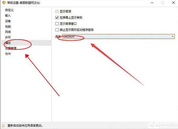 4、在设置菜单中,偏好里面找到语言切换成中文即可,最后重启。