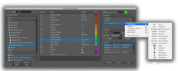 每个运音法都可以在 DP 的 QuickScribe 记谱编辑器中映射到符号、词干装饰、备用记事头或自定义文本(例如 con sordino)。符号与它们的管弦乐库声音保持连接,因此您所看到的就是您所听到的。因为音符会记住它们的符号,所以用户可以随时立即切换地图(例如,切换到不同的声音库)。此外,每个运音法都可以触发多种形式的输出,从速度变化到音符堆栈,甚至为最先进的管弦乐队库(例如 VSL Synchron 引擎)提供支持。DP 的图形编辑器在单独的通道中提供清晰、直观的发音编辑