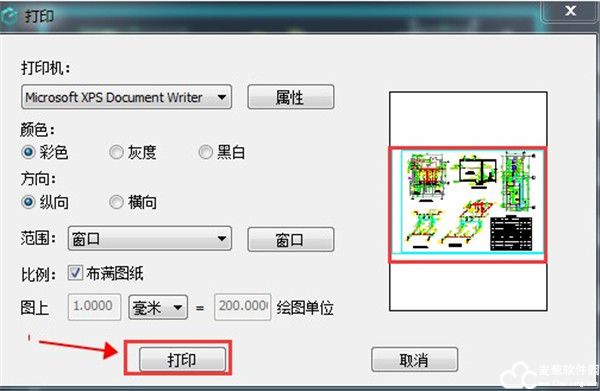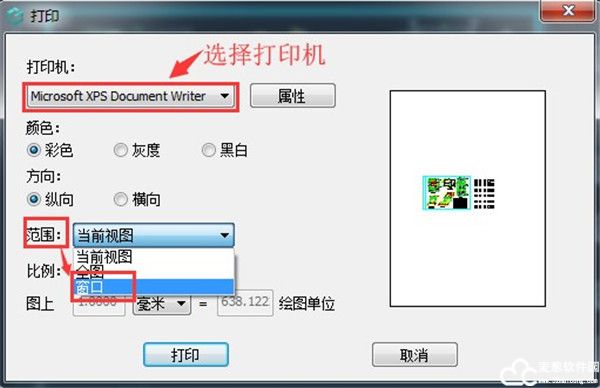3、之后选择打印机,设置颜色和方向,选择窗口;