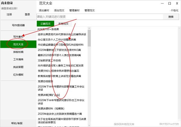 1、点击左侧的范文大全,可以查找到网络上的文章。