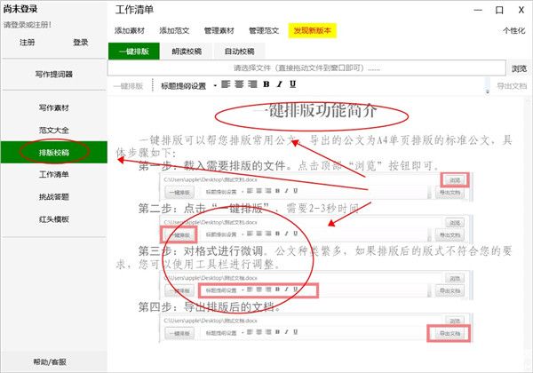 3、一键排版,加载您的稿件,单击一键排版,它将自动帮助您排版成标准的官方文档格式并进行预览。对于个别软件无法识别的文档,可以使用顶部的工具栏进行调整后微调和导出文档。将自动生成标准文档排版文档(默认为A4单页)。