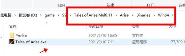 2、双击红色箭头里的Tales of Arise.exe应用程序开始运行;